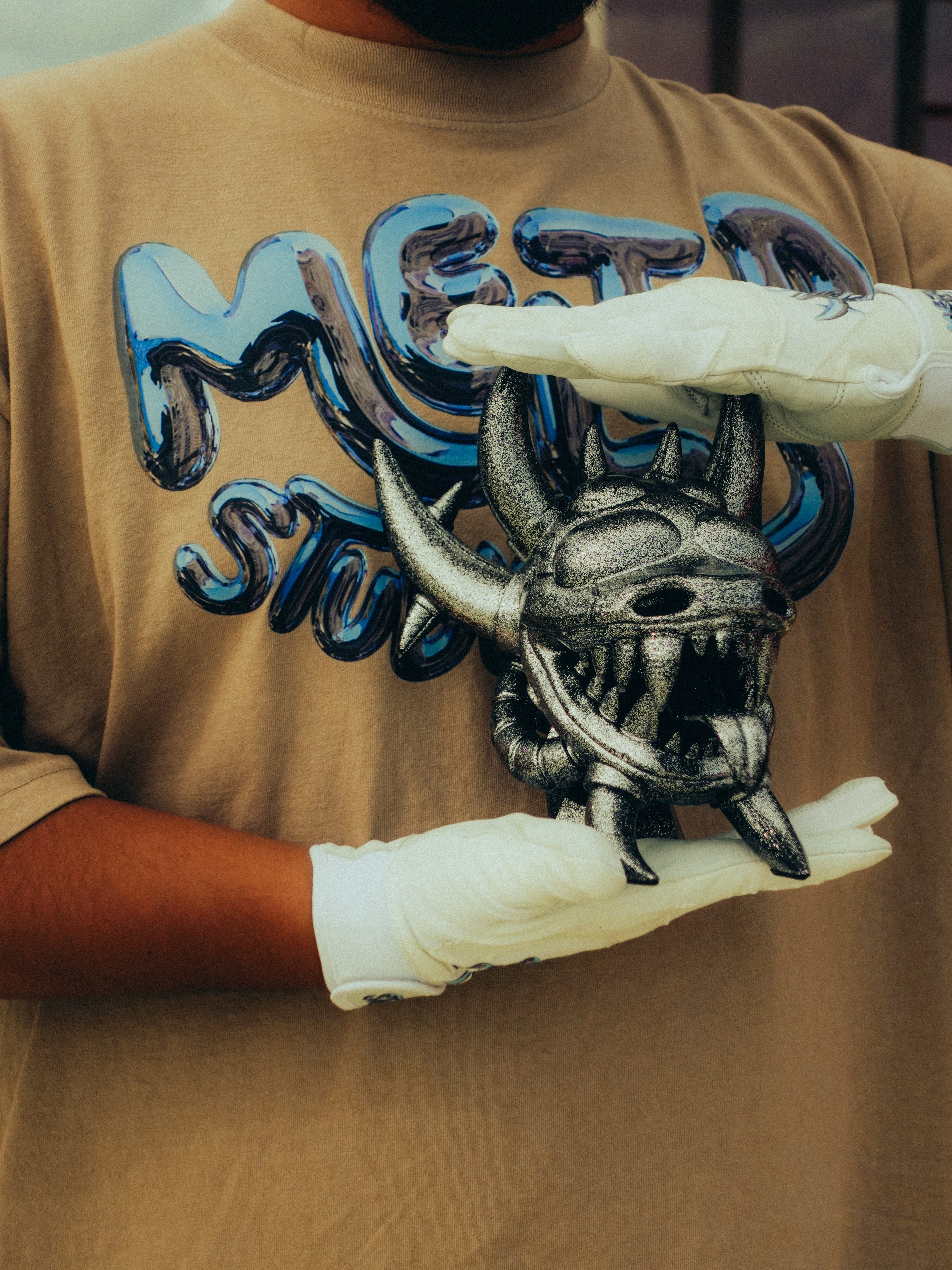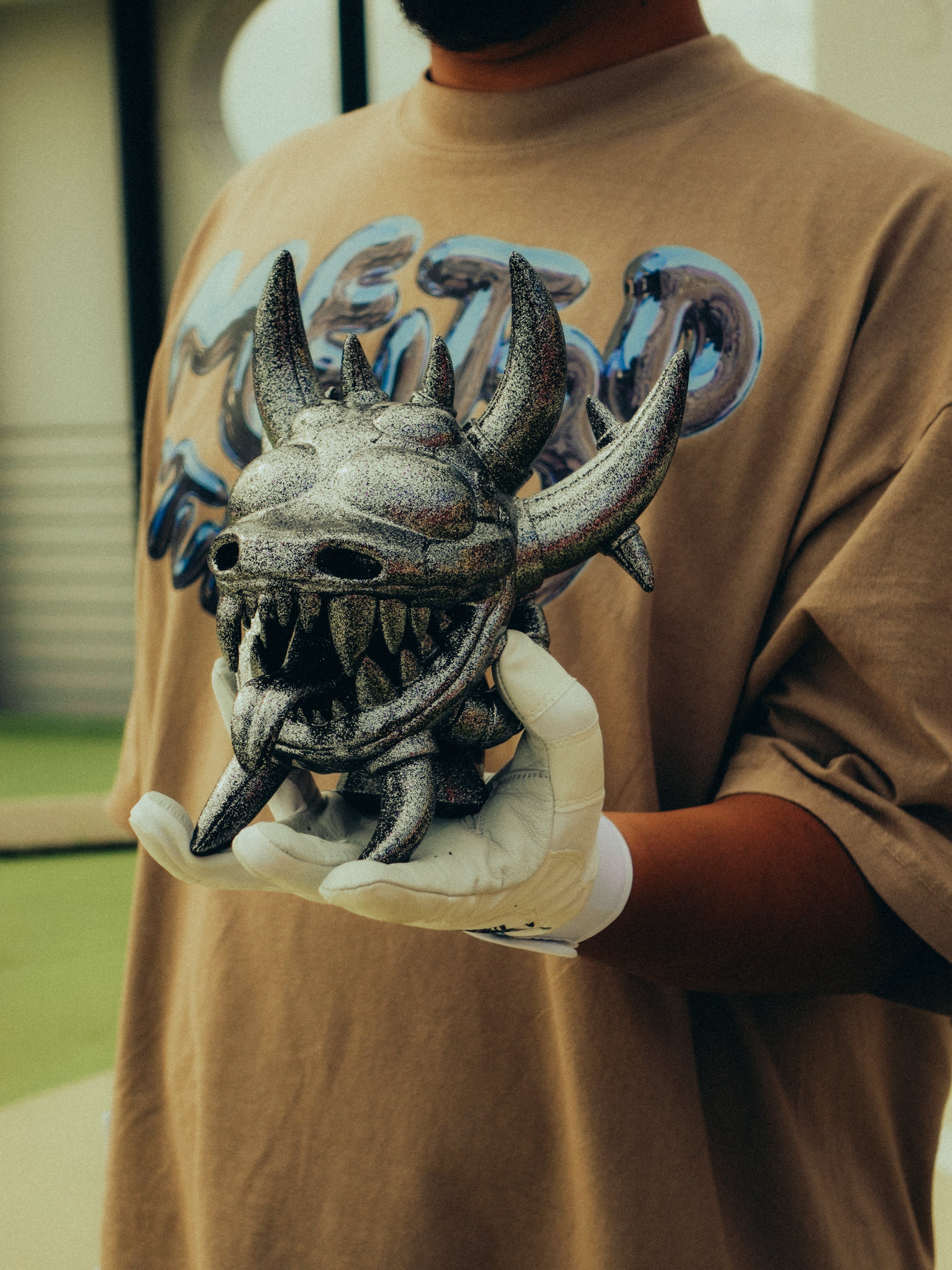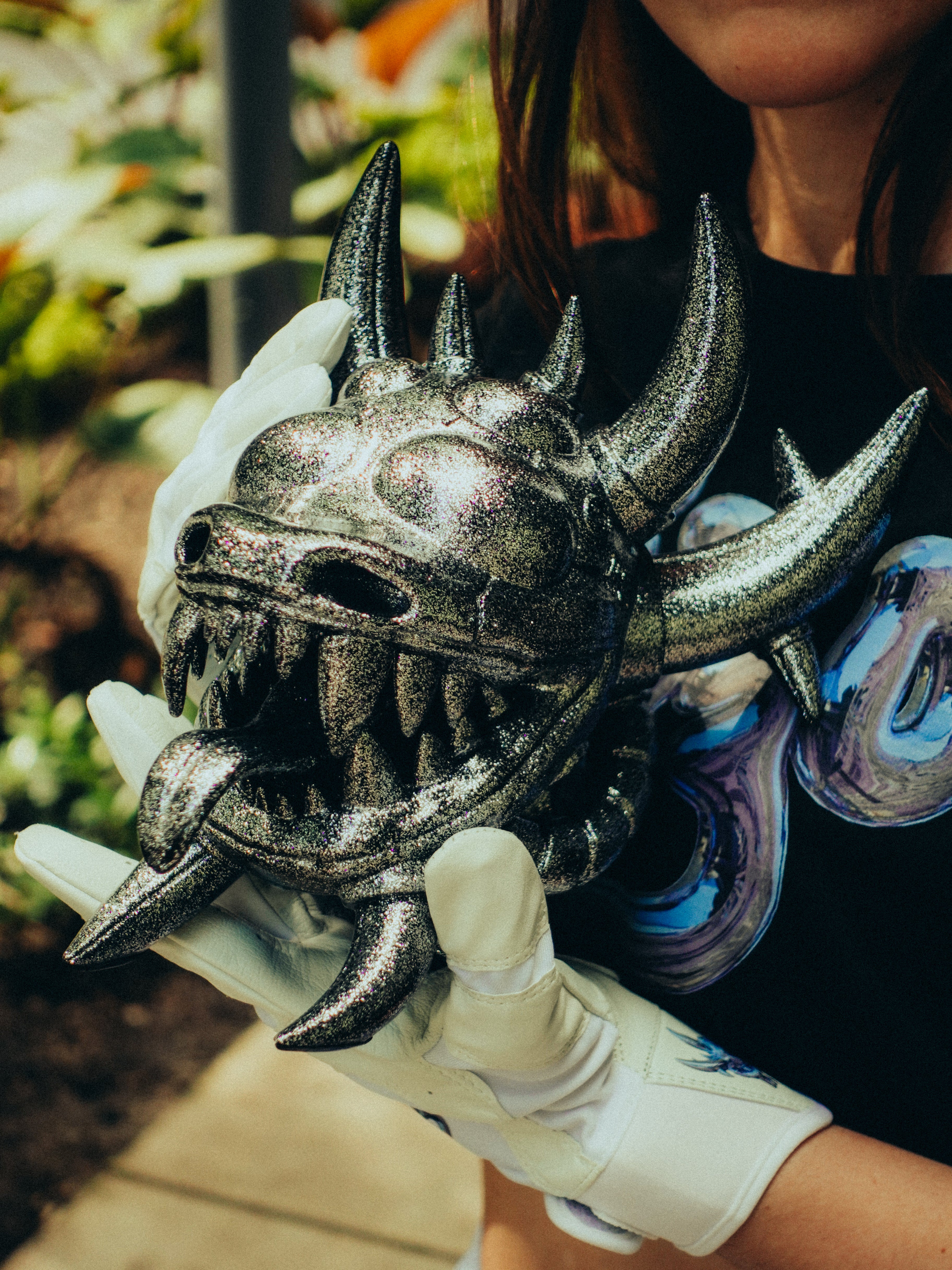 THIS PIECE IS MADE BY THE PROCESS OF VAT PHOTOPOLYMERIZATION, EACH EDITION IS 20.30 CM TALL AND WEIGHS 675 G. THE ASTRO VEJIGANTE IS AN EDITION OF 100 HELMETS THAT INCLUDES A RESIN SCULPTED ENCASEMENT, A PAIR OF CUSTOM ART HANDLING GLOVES WITH ITS EDITION NUMBER, BRANDED STICKERS, AND A CERTIFICATE OF AUTHENTICITY VERIFYING THE SAME EDITON NUMBER.